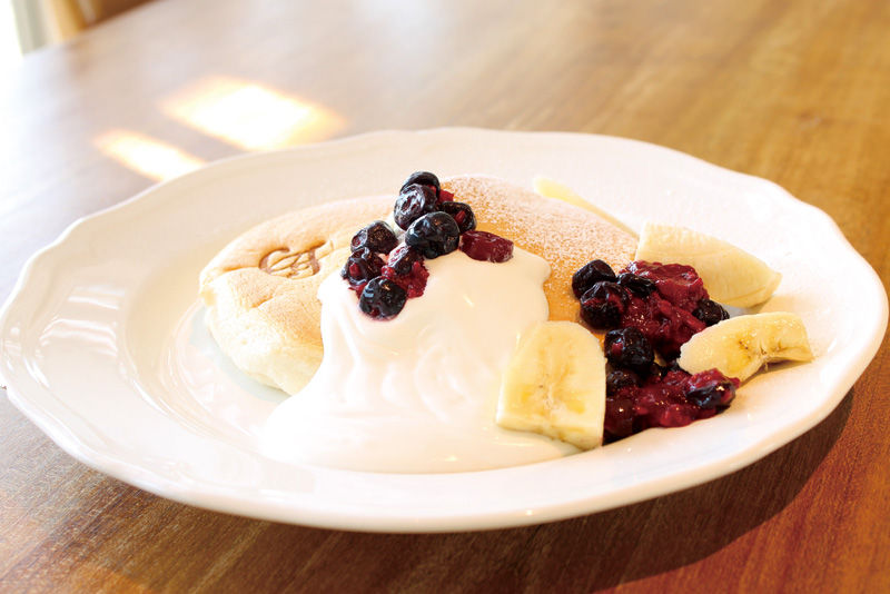 馬見丘陵公園内にある開放感溢れる「Cafe +f」さん。こちらでは、コンフィチュール作家・東 史さんが、一つ一つの食材を丁寧に手仕込みしたコンフィチュールを使った料理やパンケーキ、ジェラートがいただける。例えば、今の時期はサラダやマリネに梅のコンフィチュールを使って、爽やかなフレッシュ感をプラス。気に入ったら、瓶入りを買うこともできる。隣席との間隔もゆったりしており、ソファー席もあるので、お子様連れでも安心して食事が楽しめるのが嬉しい。