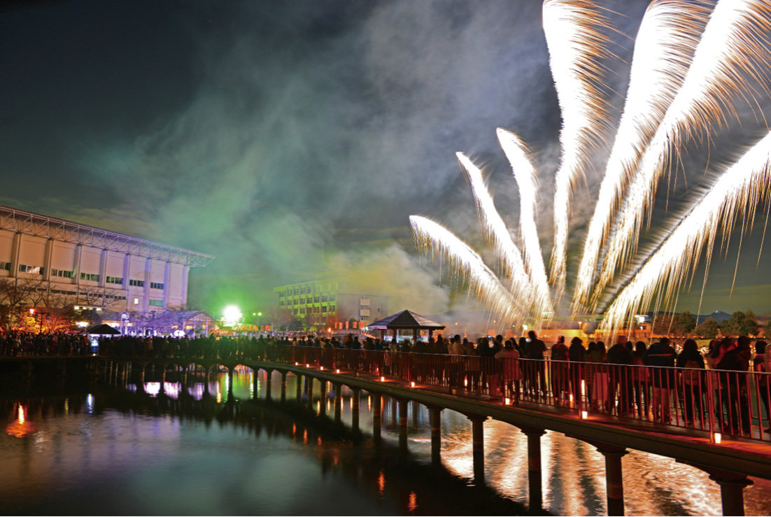 冬空を光と音で彩る幻想の祭典「冬彩」。香芝市制施行10周年を祝う行事として2001年から始まり、市民が中心となり企画、運営されている。会場の今池親水公園で18時から行われるろうそく点火には当日参加可能。メインステージで行われる様々なイベントや味自慢の屋台料理はもちろん、フィナーレを飾る香芝天衝太鼓と花火のコラボレーションは圧巻!