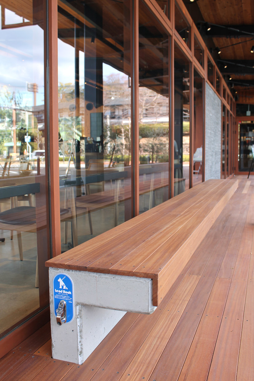 エントランス前の長いベンチには、リードフックも。