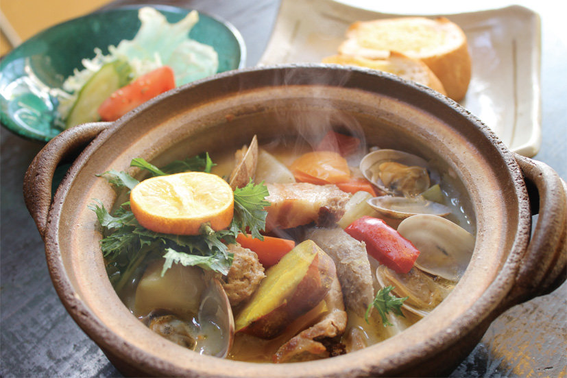 人参などの根菜類からやさしい旨みをプラス。柔らかく煮上げた豚肉、あさりの酒蒸し、