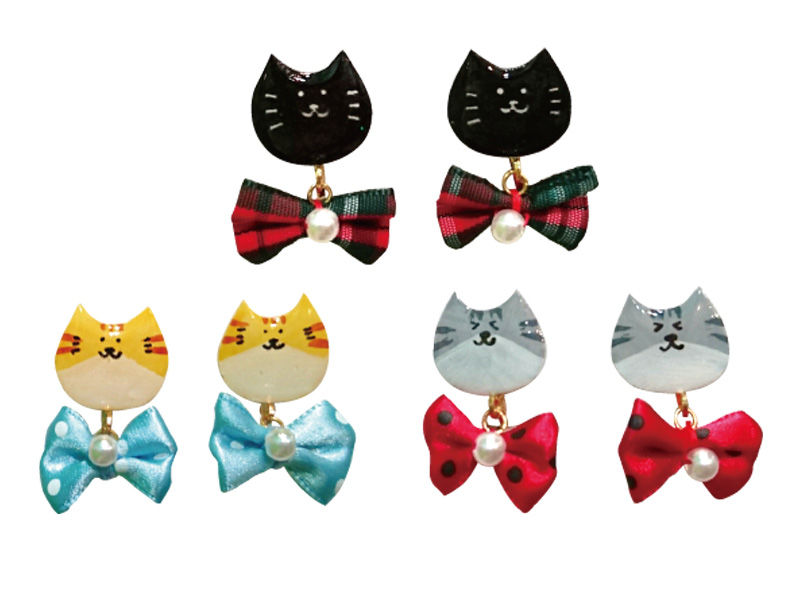 ・ゆるネコ×リボンのアクセサリーピアス800円、イヤリング900円