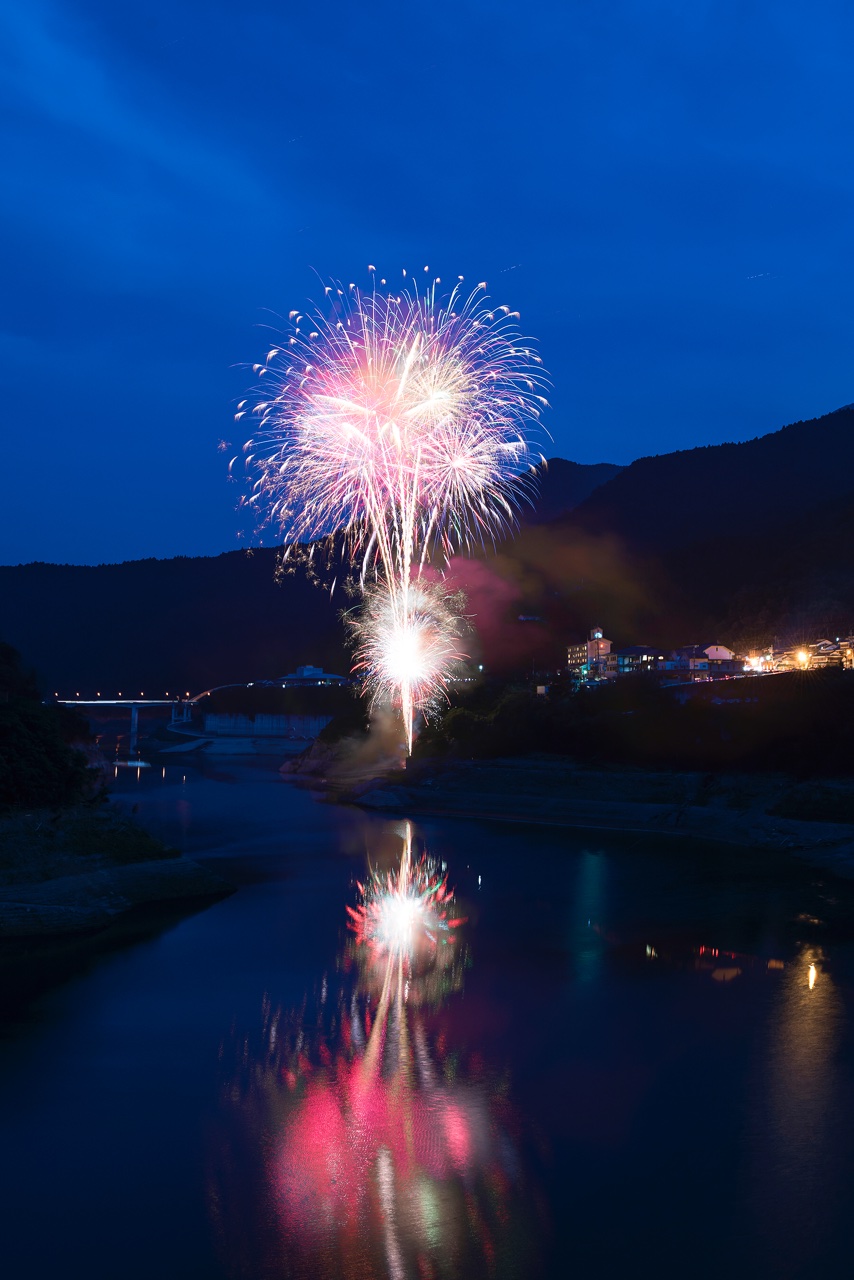 ダムの湖面に美しい花火が映し出されます。
