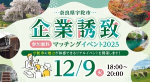 宇陀市をより身近に感じてもらう体験を提供 本イベントは、 宇陀市への進出を具体的に検討されている企業様向けの個別相談会 (3社限定・希望制)と、 市の魅力や進出済企業の生の声を聞ける交流会の二部構成で実施し ます。 1. 個別面談会(3社様限定・希望制) 宇陀市担当者が、参加企業の具体的な進出計画や、用地・ 補助金等の個別の質問・要望に直接お答えします。 2. 企業誘致 交流会 宇陀市の魅力プレゼンテーションのほか、 実際に宇陀市で活躍する進出済企業様からのお話を聞けるセッショ ンを設けています。 第2部では、宇陀市の特産品のご試食等もご用意し、 立食形式で宇陀市職員をはじめ、 登壇者や参加者と直接交流していただけます。 <開催概要>