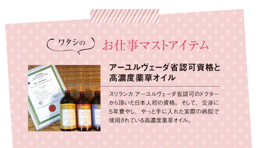 お客様の日々の不安に対するアドバイス方法として、私どもセラピストは、できる限りアーユルヴェーダの知恵を正しく伝承し、それを現代に合わせた活用方法を提案し、美と健康を提案する人々を応援できることを目標としています。