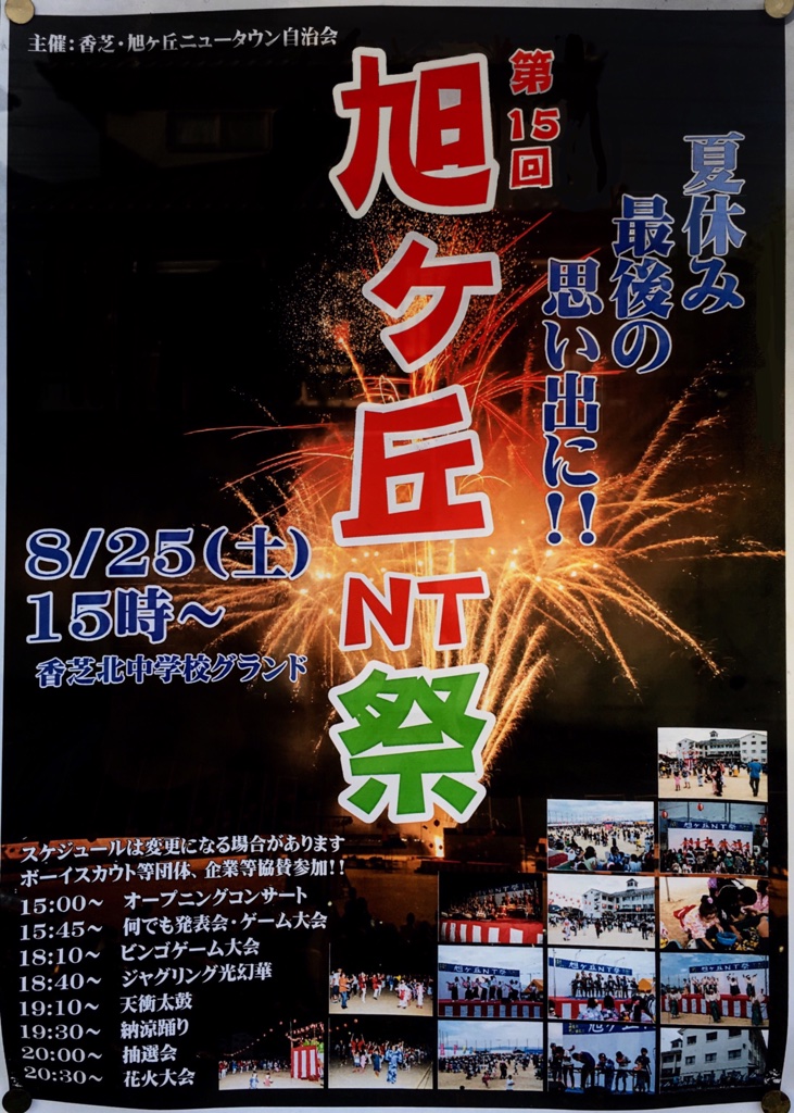 2018年08月12日 2018年8月25日(土)「第15回旭ヶ丘NT祭」in 香芝市立香芝北中学校 ☆花火の動画付き! カテゴリ:イベント情報奈良ニュース 8月最後の土曜日に開催される夏祭り。夏休み最後の思い出に!15:00〜 オープニングコンサート15:45〜 何でも発表会・ゲーム大会18:10〜 ビンゴゲーム大会18:40〜 ジャグリング光幻華19:10〜 天衝太鼓19:30〜 納涼踊り20:00〜 抽選会20:30〜 花火大会※屋台有り 第15回旭ヶ丘NT祭●場所:香芝市立香芝北中学校 ●住所:奈良県香芝市旭ヶ丘4-14 ●駐車場:無 ●打上時間:20:30〜●祭り時間:15:00〜 ●打上数:約5分■情報提供:horibonpapaさん(写真・動画撮影:horibonpapaさん)■参考記事:《2017花火撮影第7弾》旭ヶ丘NT祭http://gazoo.com/my/sites/0000986428/horibonpapa/Lists/Posts/Post.aspx?ID=618 タグ :#旭ヶ丘NT祭#2018年花火#花火大会 「イベント情報」カテゴリの最新記事 「奈良ニュース」カテゴリの最新記事 オリンピックフラッグ・パラリンピックフラッグが奈良市にやってきます!2018年8月23日(木)・24日(金)「元興寺地蔵会万灯供養」奈良市中院町