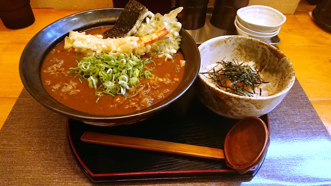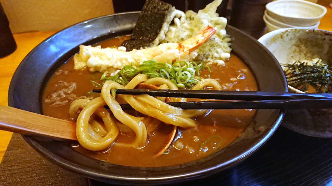 出てきたのは大きな海老・海苔・大葉の天ぷらが乗ったカレーうどん。まずはお汁をいただくと、飛び込んできたのはフルーティーな味。 果物とかそんな味の後に、カレーの辛さが来て、さらに出汁の味がふんわりと包んでくれます。こ、これは確かに初めて食べる味。乗っている天ぷらも揚げたてサクサクで良いアクセントになり、飽きることなくカレーうどんを食せます。