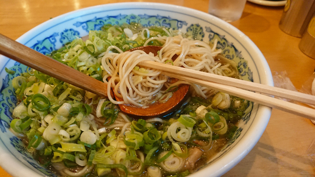 京都ラーメンに多い鶏ガラベースの醤油味に、細目ストレート麺。
