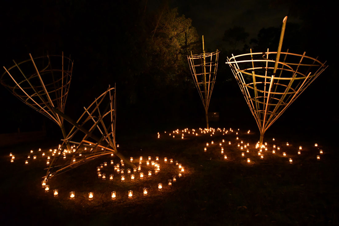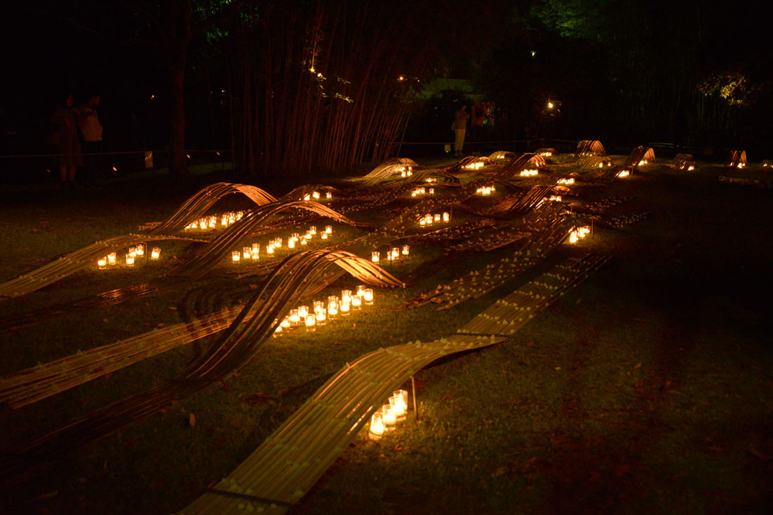 秋夜に浮かびあがる竹の造形物とろうそくのあかりで、普段味わうことができない幽玄な風景が生まれます。