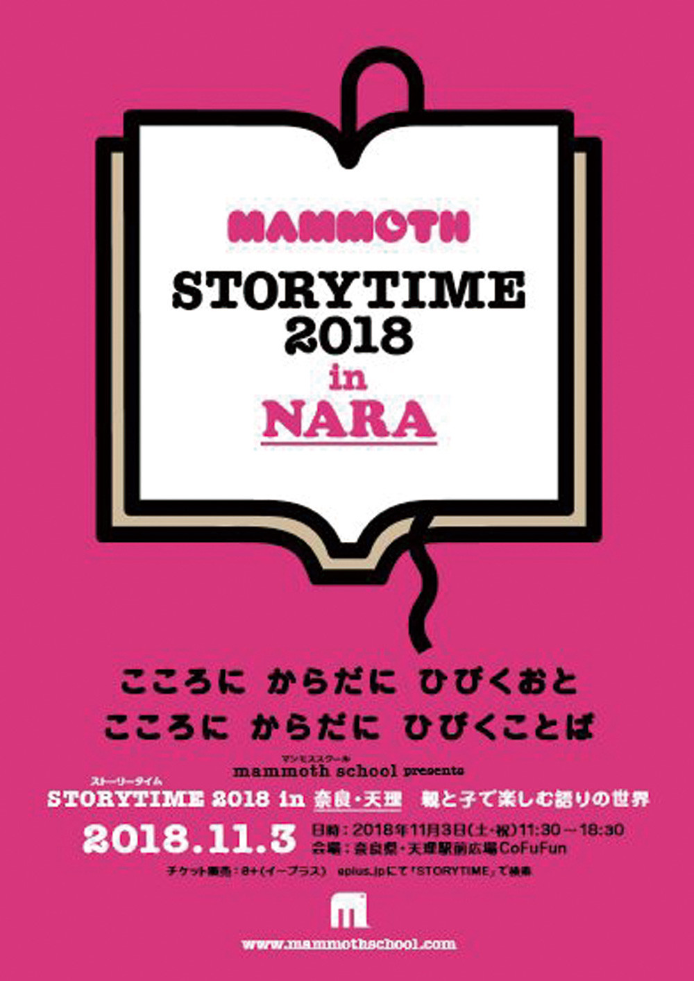「あそびのなかにこそ学びがある」をコンセプトに、子どもやファミリー、子どもの心をもった大人たちに向け、豊かなこころを育むきっかけとなるアイデアを発信し続けてきた「マンモススクール」。その「マンモススクール」が”ことば”と”音”を感じて楽しむイベント「STORYTIME(ストーリータイム)」を天理駅前広場CoFuFunにて開催!昔から語り継がれてきた物語と生まれたばかりの物語。語り手がことばを紡ぎ、音楽家が音をのせ、聞き手のこころとからだに心地よい響きをお届けする。