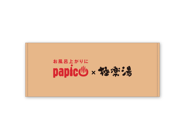 コラボキャンペーン期間中、店内でパピコを販売。パピコを購入されたお客様には、コラボ限定「パピコ×極楽湯」タオルをプレゼントします。