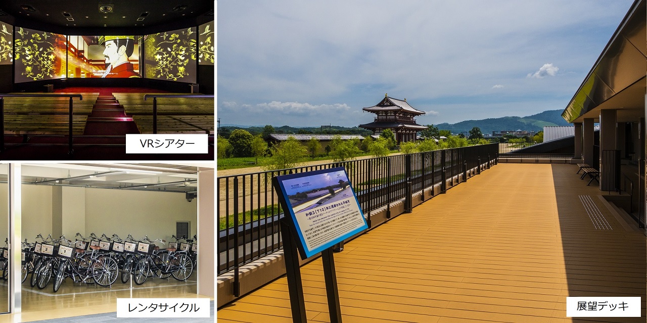 ●展望デッキや宮跡展望室(有料・貸会議室)からの平城宮跡の眺望が楽しめます。また、レンタサイクルの受付、更衣室・シャワー室のあるジョギング・サイクルステーションです。