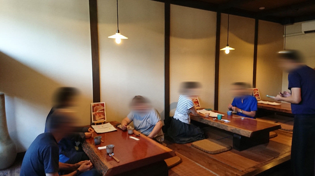 暖簾がかけられ、店内へ。テーブル席と、小上がり席があります。