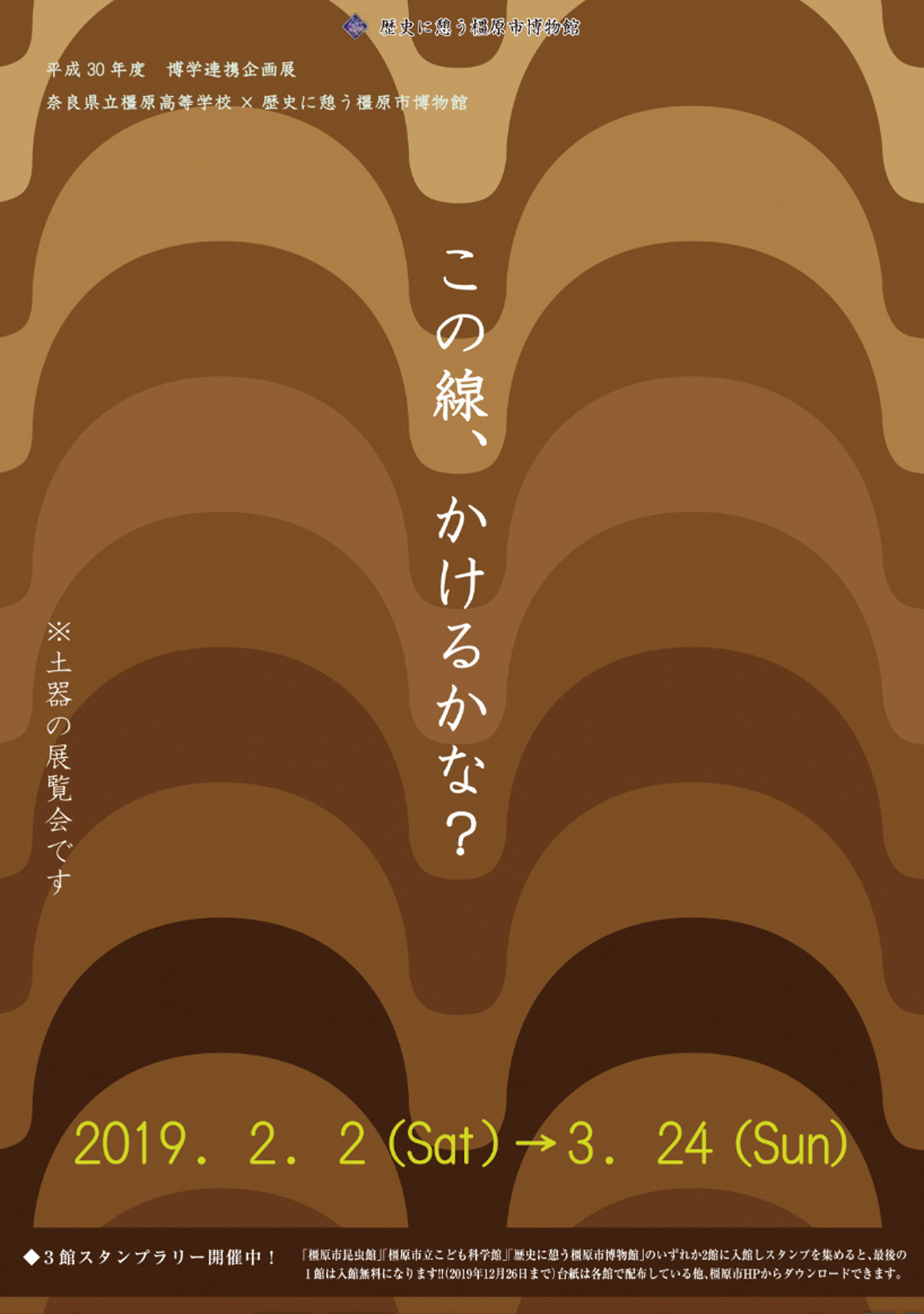 今回で3回目となる県立橿原高校と橿原市博物館の共同企画展示。今回もちょっとマニアックに土器の魅力にせまる。君は、美しい文様の土器を見て「きれいだ!」と感じても文様を描く方法を考えてみたことはあるかな?土器の観察と実験を通して、文様の描き方に迫る展示を見終わった時には、土器を見る目が変わること間違い無し!