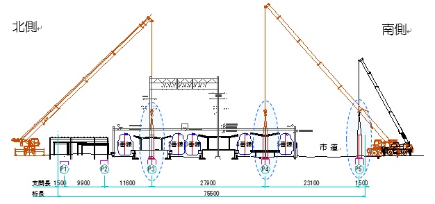 設置した橋脚の上に通路の床部分を南側からクレーンで釣り上げて設置します。