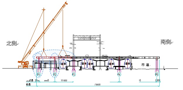 自由通路の橋脚を駅の北側と南側からクレーンで釣り上げて設置します。