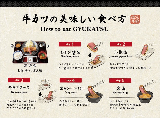 お膳には様々な食べ方を楽しんで頂ける様、全5種類(①だし醤油 ②山椒塩 ③牛カツソース ④京カレーつけ汁 ⑤京玉)の薬味やつけだれをご用意しております。まず一口目は、たっぷりのわさびを乗せ特製のだし醤油をつけて食べて頂くのがおすすめ。さらに山椒塩、牛カツソース、和風カレーつけ汁、半熟卵などバリエーション豊富な食べ方が京都勝牛の最大の魅力です。