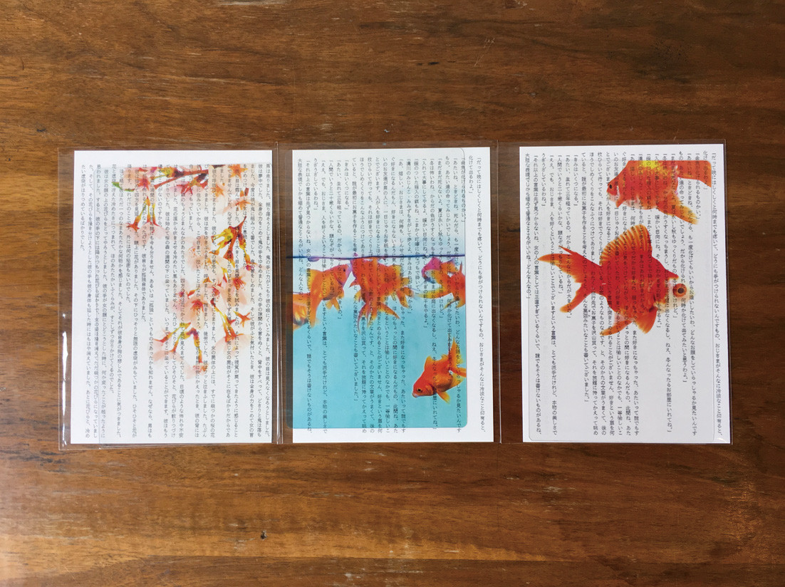 安堂真季さんの写真を透明なプラスチック素材にプリント。読みかけの本に桜が咲き金魚が泳ぎます。/税込540円