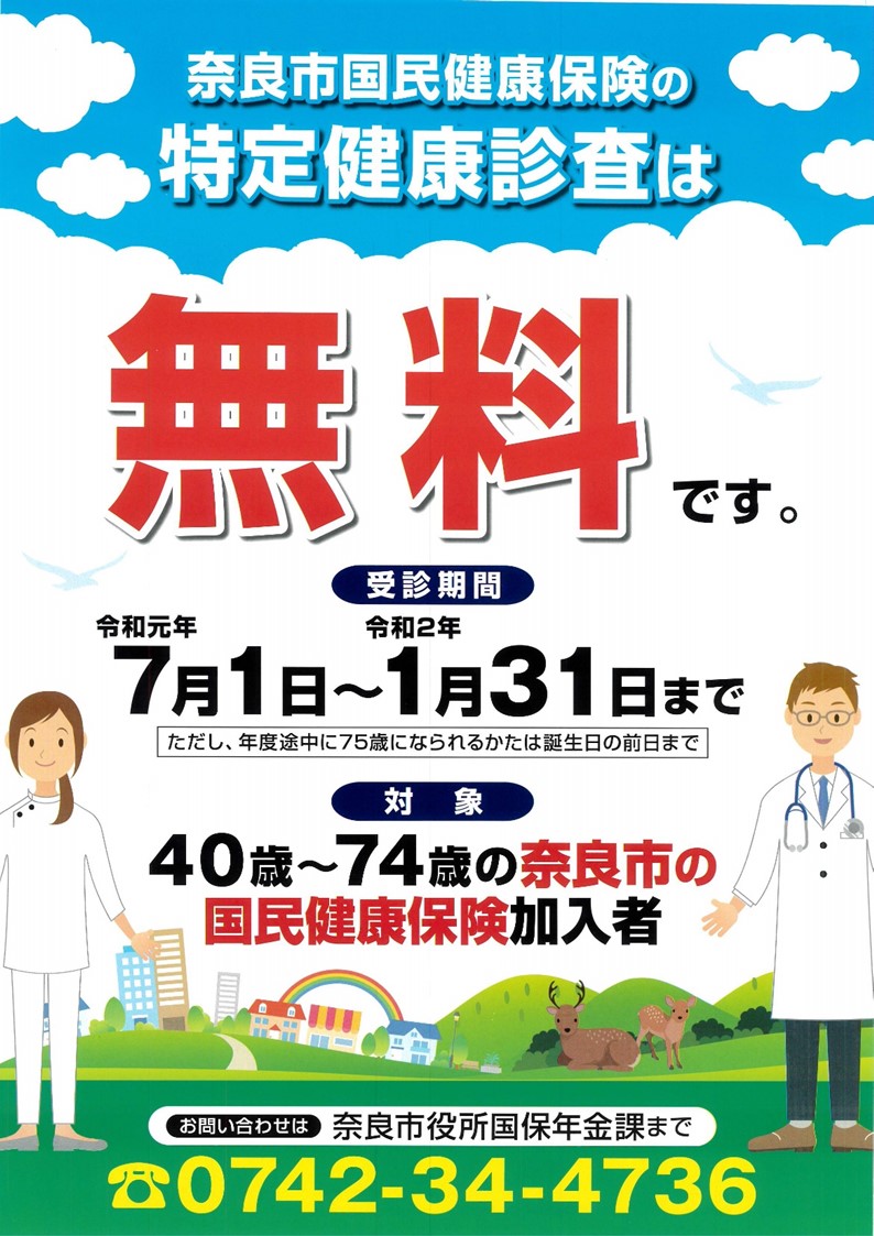 奈良市では、令和元年7月1日から、40歳から74歳の国民健康保険加入の全世帯において、奈良市国民健康保険特定健康診査の受診料の無料化を実施。