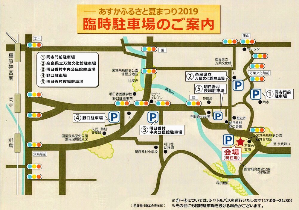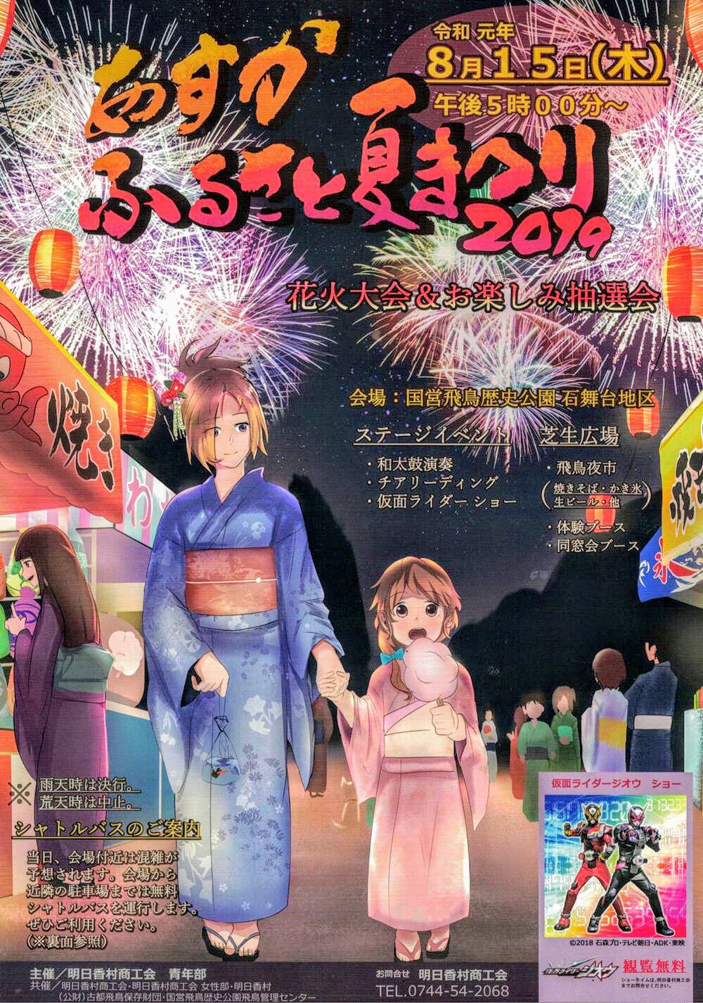 2019年08月02日 【奈良の花火大会2019】 2019年8月15日(木)開催! 「あすかふるさと夏まつり2019」 in 明日香村石舞台地区 カテゴリ:イベント情報 8/15あすかふるさと夏まつり 中止(延期無し)明日香村商工会HPhttp://web1.kcn.jp/asuka/1/event.html#section2【プログラム】飛鳥夜市(屋台)、和太鼓演奏等ステージイベント、お楽しみ抽選会など子供から大人まで楽しめるイベントが盛りだくさん。あすかふるさと夏まつり2019●日程:2019年8月15日(木)●場所:国営飛鳥歴史公園石舞台地区 ●住所:奈良県高市郡明日香村島庄 ●駐車場:有り、臨時駐車場よりシャトルバス運行 ●打上時間:21:00頃 雨天決行・荒天中止●祭り時間:17:00~21:00頃まで ●打上数:非公表●問合せ:TEL:0744-54-2068(明日香村商工会) ■情報提供:horibonpapaさん タグ :#明日香村#あすかふるさと夏まつり#夏祭り#奈良の花火大会2019 「イベント情報」カテゴリの最新記事 8/3はパールミルクティーの日!タピオカドリンク専門店「パールレディ」でミルクティー無料券がもらえるキャンペーン!【夏の遊び対決!アウトドア編】SUP体験会Halfday 奈良吉野川