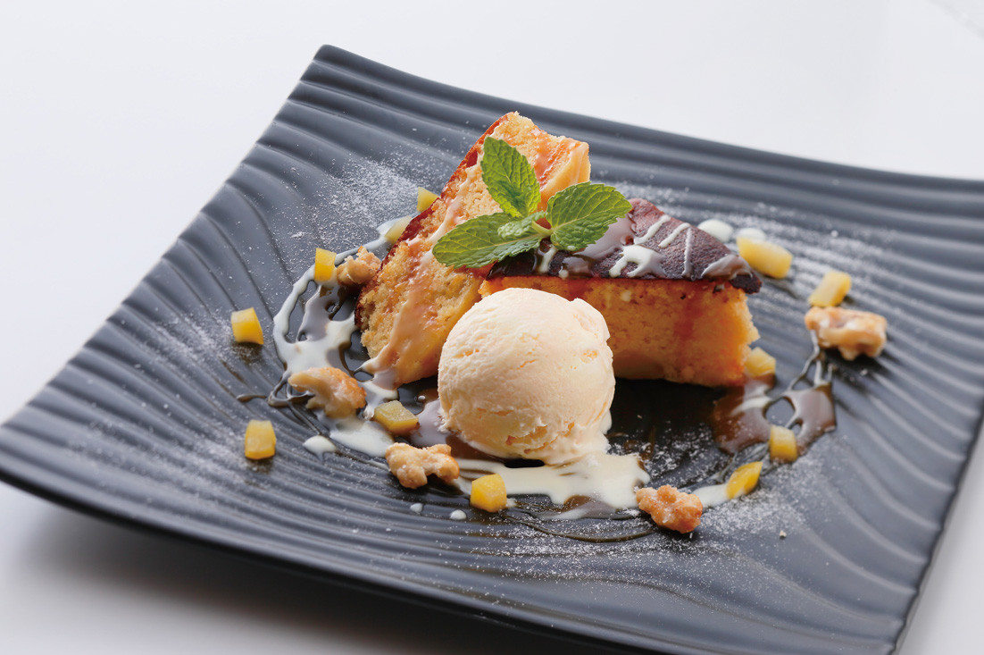 しっとりした栗の蒸しケーキにバニラアイス、キャラメルソース、バニラソース、胡桃などが添えられています。毎年これを目当てにするリピーター多数の人気商品。(税・サービス料込950円)