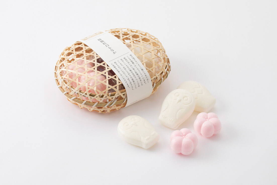 梟(ふくろう)は「福籠」という語呂合わせから、「福を籠に入れておく=福が逃げない」という意味があるとされる縁起のいい鳥。これにかけた、六つ目編みの籠に入った梟のもなかのセット。