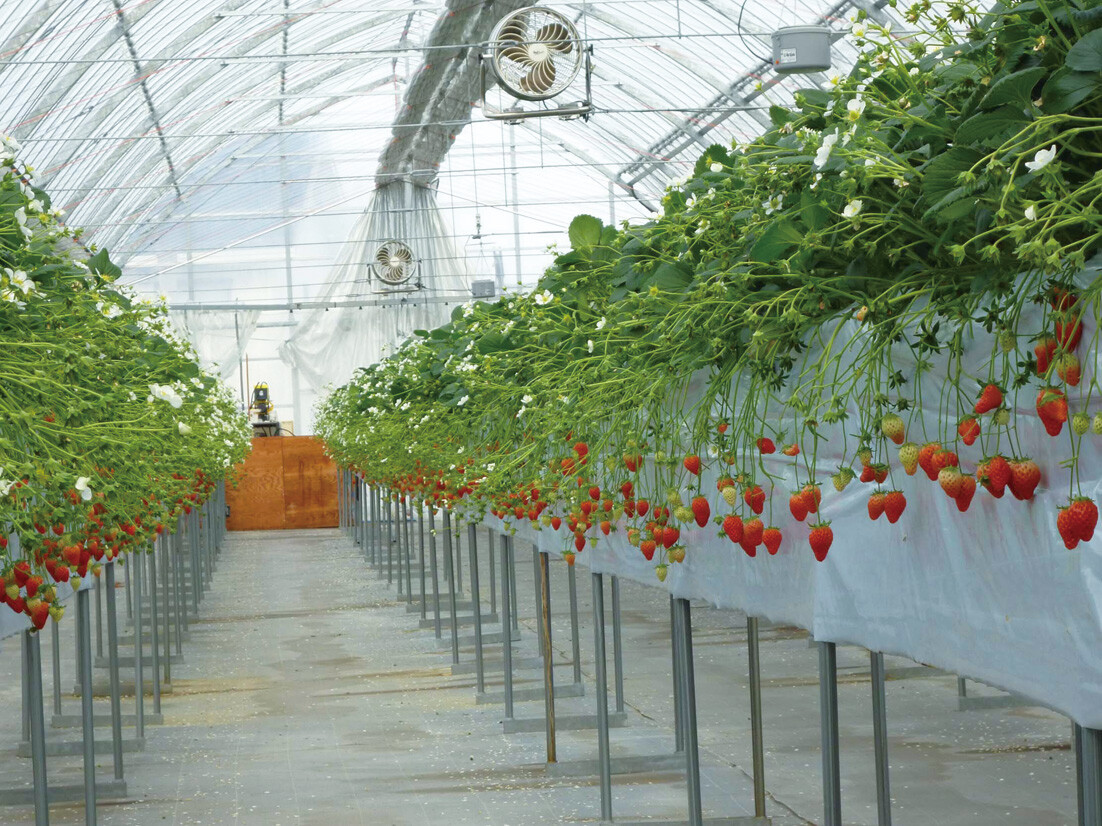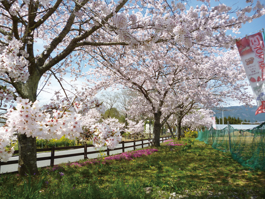あだみね高原ファームでは、自然の中でくつろぎながらおいしい農作物をいただけます。いちごは腰の高さに植えてあるので立ったまま楽しめ、足や腰の痛い方も、ベビーカーや車椅子でも大丈夫。子どもは顔のすぐ前にいちごが来るので大興奮!食べ放題の後は隣接する山林から切り出した木材で作ったミニアスレチックで遊んだり、バーベキューをしたり(入園料別途必要・食材は持参)。暖かくなれば桜並木も美しいですよ。