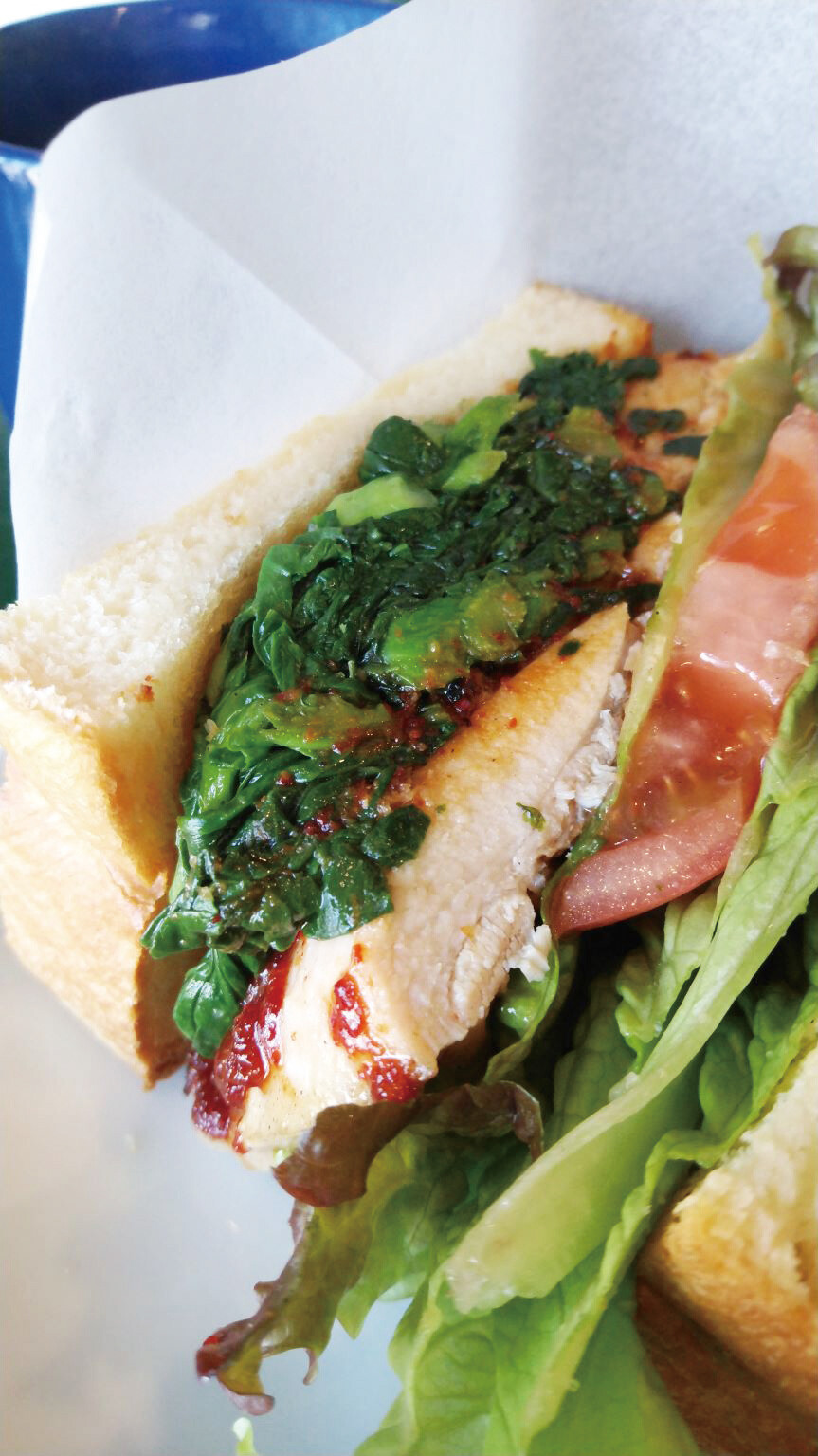 自家製コチュジャンを塗ったチキンにじっくりと火を通し、小松菜と菜の花のナムルを一緒に挟んだ、うま辛サンドイッチ。