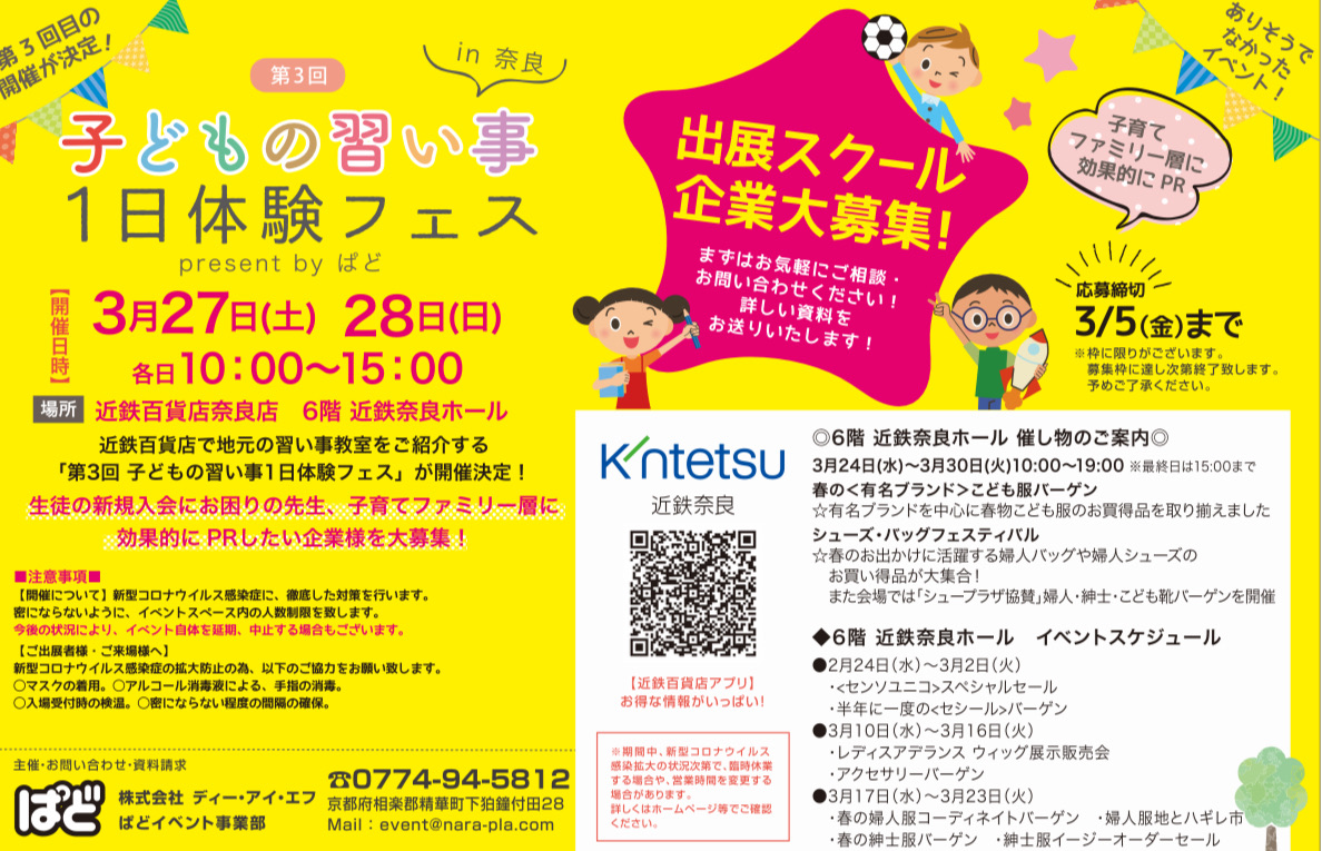2021年02月22日 出展スクール募集!【3月27日(土)28日(日)開催!】子どもの習い事1日体験フェス in 近鉄百貨店奈良店 カテゴリ:イベント情報奈良ニュース 出展スクール・企業様大募集! 【3月27日(土)28日(日)開催!】子どもの習い事1日体験フェス in 近鉄百貨店奈良店春休みに習い事の体験フェスに出展しませんか?コロナ対策していますので安全に生徒募集できます。土・日どちらかの出展でも構いません。習い事1日体験フェスに関するお問い合わせ 株式会社ディー・アイ・エフ ぱどイベント事業部Tel 0774-94-5812(担当:周榮(しゅうえい)) Fax 0774-98-2662 もしくはevent@nara-pla.comまで 「イベント情報」カテゴリの最新記事 「奈良ニュース」カテゴリの最新記事 【2021年2月19日発行】奈良のお得なクーポン満載!NARAPLA COUPON特集【3月26日(金)27日(土)】けいはんな映画劇場「糸」