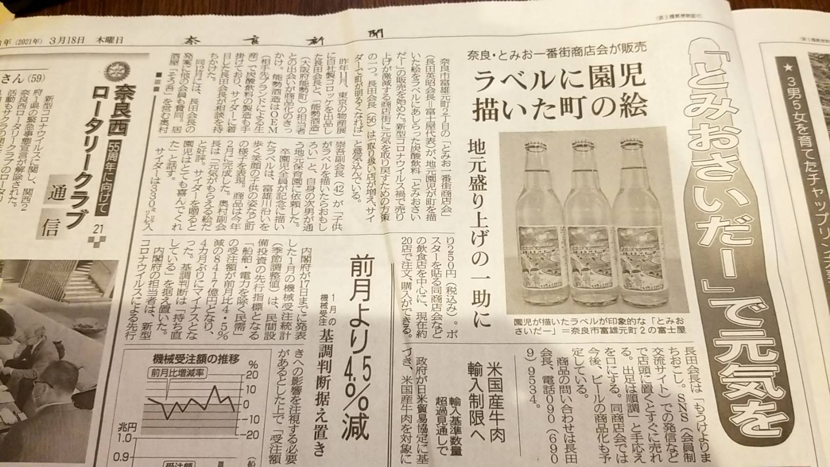 2021年04月09日 【ご当地グルメ】奈良・とみお一番街商店会が販売「とみおさいだー」飲んでみた! カテゴリ:奈良ニュース こんにちは。奈良市富雄町のとみお一番街商店会が町おこしのいっかんとして販売している「とみおさいだー」を先日「家具の久丹吉」さんに頂きました。奈良新聞にも掲載されて地元盛り上げの一助にとみお一番街商店会が販売を始めました。ラベルは富雄在住の園児たちが富雄をイメージして描いたデザインでとてもかわいいです。1本250円で「とみお一番街商店会」加盟店で販売しており購入する事が出来るみたいです。4月上旬時点ですでに限定数の半分以上は売れている貴重な「とみおさいだー」を一度お試し下さい! 「奈良ニュース」カテゴリの最新記事 ならぷら求人:無料掲載お考えの企業様へ【2021年版】医療機関情報誌「ご近所ドクターBOOK」を発行しました!