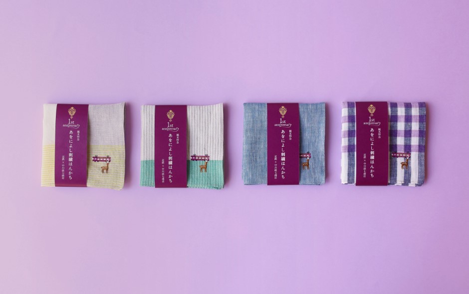 中川政七商店の人気商品に、あをによしのモチーフを施したコラボアイテムを、あをによし車両他で販売。刺繍はんかち(1,550円)には、車両と鹿を刺繍し、奈良の工芸「かや織」の生地を5枚重ねたふきん(700円)には、あをによしの車両や鹿の柄があしらわれています。