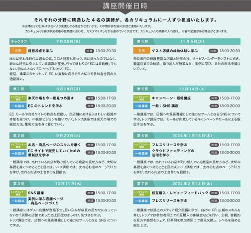 講師にはECの実務・運営経験豊富な人材を揃え、奈良県のEC実績のある店舗のゲスト登壇も複数予定。