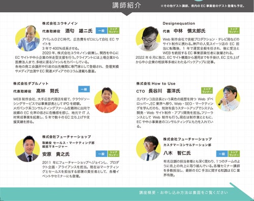 さらに、ECサイト構築プラットフォームを提供する株式会社フューチャーショップや、楽天市場を運営する楽天グループ株式会社からも講師が登場予定となっております。