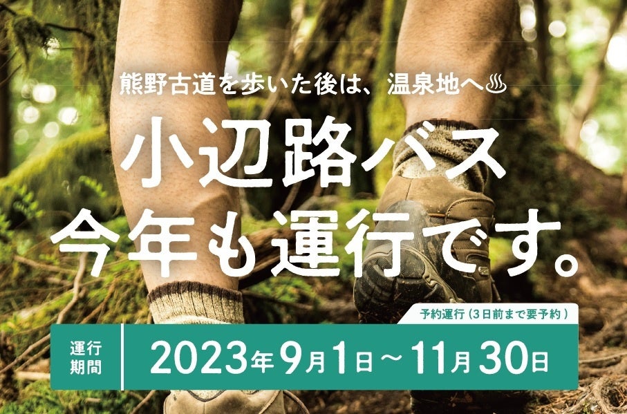 小辺路を歩かれる方向けに、アクセスが不便な三浦口と宿泊施設を結ぶ「小辺路バス」を2023年9月1日(金)から2023年11月30日(木)まで期間限定で運行いたします。