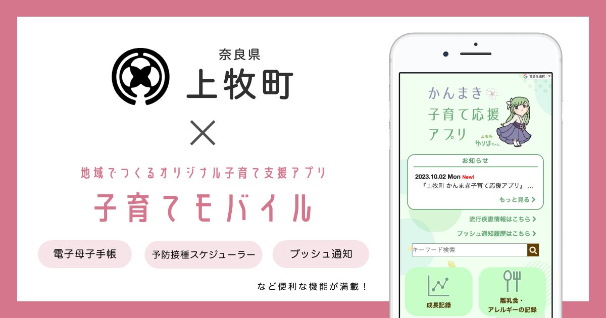 妊婦・子育て家庭に寄り添う「伴走型相談支援」のより一層の充実を図るため、奈良県内3自治体(三郷町・明日香村・吉野町)でも取り入れられている 子育て支援アプリ「子育てモバイル」を導入する運びとなりました。上牧町オリジナルのデザインを施し、子育て支援アプリ「上牧町
