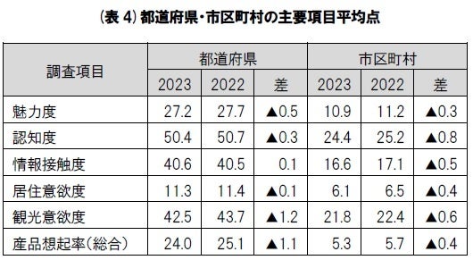 その他の項目では、それぞれの地域名を認知しているかを問う「認知度」が都道府県、市区町村ともに平均点が低下しているほか、各地を訪れてみたいかどうかの行動意向を問う「観光意欲度」も、都道府県平均が42.5点で前年から1.2点低下。市区町村平均も21.8点で0.6点低下している(表4)。