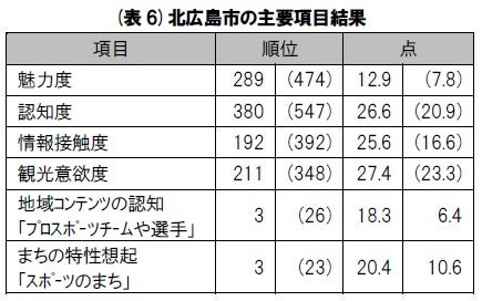 今年、市区町村で最も魅力度の点数が上昇したのは北広島市(北海道)となった。同市は前年の7.8点(474位)から12.9点(289位)と5.1点上昇。他の項目では認知度や情報接触度といった地域名の周知性に関する項目も上昇しており、調査項目・地域の特性想起「プロスポーツチームや選手」は6.4%から18.3%と11.9ポイントも上昇している。同市では他にも観光意欲度が上昇している(表7)。
