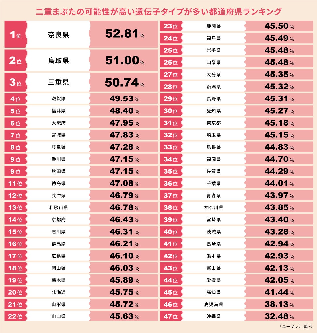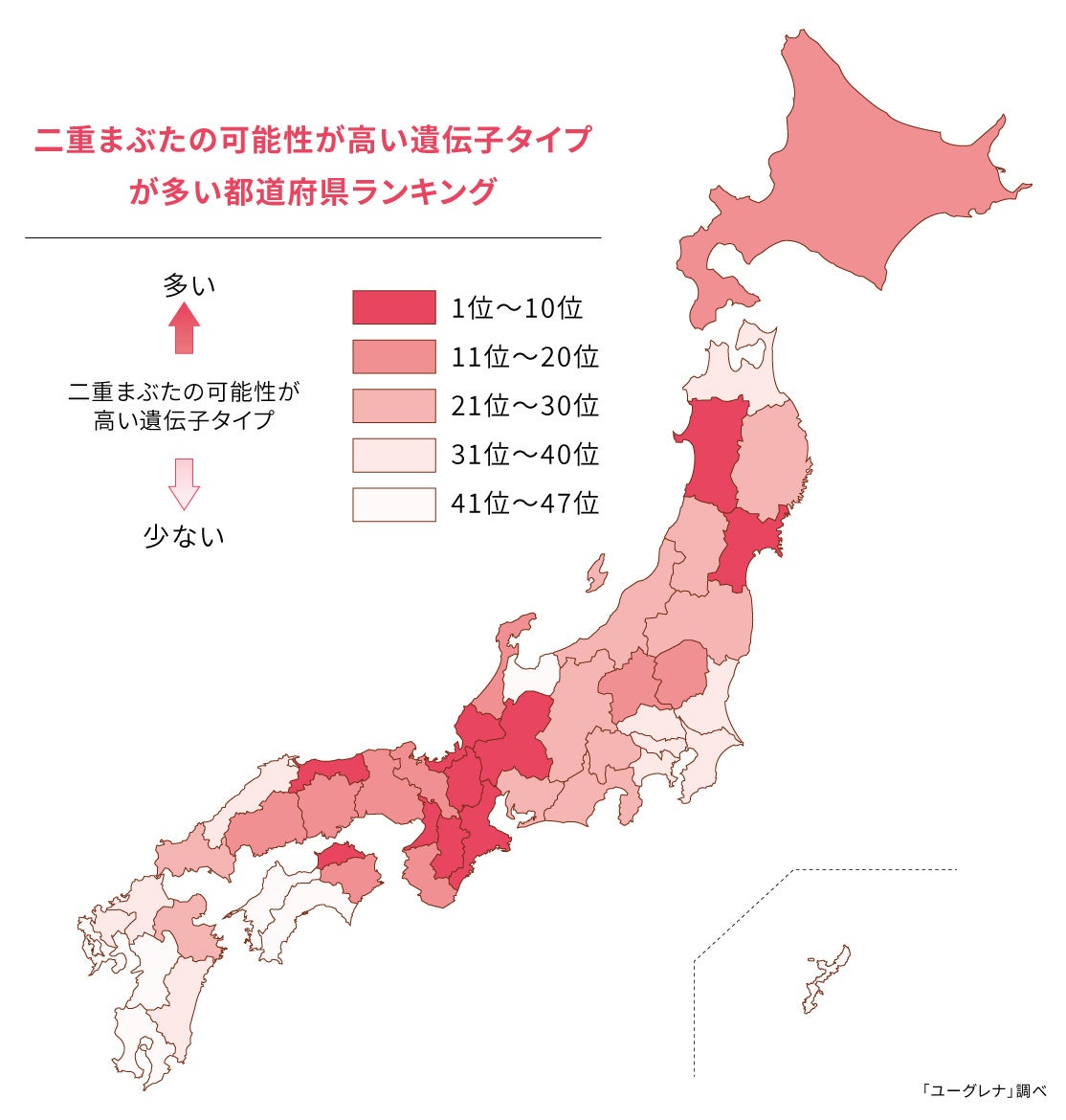株式会社ユーグレナ(本社:東京都港区、代表取締役社長:出雲充)は、ユーグレナ・マイヘルスとジーンクエストの遺伝子解析サービスのゲノムデータをもとにした「二重まぶたの可能性が高い遺伝子タイプが多い都道府県※1ランキング」を公開します。