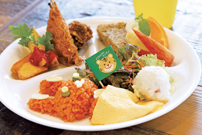 かわいいチキンライスに、唐揚げ、エビフライ、ポテト、デザート付。ランチはフリードリンク&サラダバー付(10歳まで)