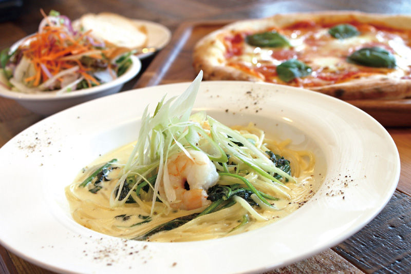 週替りのパスタ、またはピザがいただける人気のランチセット。パスタは、淡路島の風土が練り上げた「究極の生パスタ」を使用。モチモチ感と、噛むほどに小麦本来の甘みが広がる(写真は、エビと季節野菜の豆乳パスタ)。ピザは、注文が入ってから伸ばして、350℃の専用オーブンで焼き上げることで、モチっと香ばしい生地に仕上げる(写真は、マルゲリータ)。ランチは全て90分制(フリードリンク、サラダバー付き)で、他にもライス&ボウル、グリルランチ、フライドランチもあり。